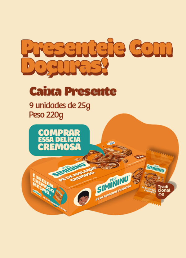 Pé de moleque cremoso, feito com leite condensado e amendoim, receita exclusiva de família. A Caixa Presente vem com 9 unidades de pé de moleque de 25 gramas .